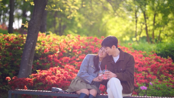 Standing under falling cherry blossoms on campus, Seo Eun-ho greets the female lead Seo Mi-rae (played by Jisoo) with a warm smile, instantly setting the tone for a sweet and emotional storyline.